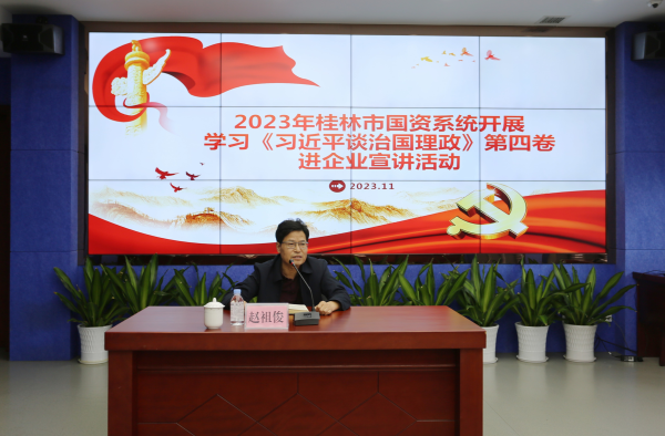 11月23日,桂林市國資委黨委委員、副主任趙祖俊到集團(tuán)公司開展黨課宣講,向企業(yè)黨員干部職工宣講《習(xí)近平談治國理政》第四卷精神要義,并對基層企業(yè)改革發(fā)展進(jìn)行指導(dǎo)。集團(tuán)公司黨委副書記劉波及領(lǐng)導(dǎo)班子、集團(tuán)公司總部全體黨員、各成員單位黨員干部職工代表等參加學(xué)習(xí)。