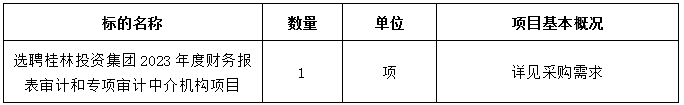 1.項(xiàng)目名稱:選聘桂林投資集團(tuán)2023年度財(cái)務(wù)報(bào)表審計(jì)和專項(xiàng)審計(jì)中介機(jī)構(gòu)項(xiàng)目